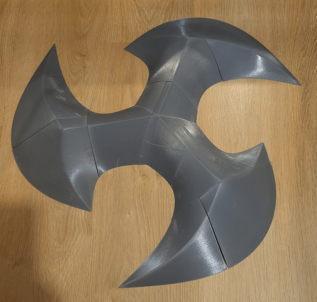 Una de las primera pruebas que hemos hecho, ha sido el Escudo de Leina, de Queen´s Blade. Proviene de una figura de escasos centímetros, pero lo pude reconstruir y con mucha paciencia y visión espacial, aumentarlo hasta un tamaño 1:1. Se añadieron las ranuras para meter las cintas de las agarraderas, y luego se separó en piezas, esperando que no se moviera la escala ni un milímetro, porque dos de las ocho piezas salieron mal al escalarlas.